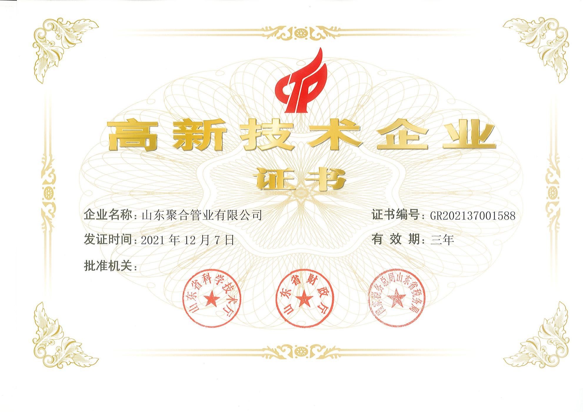 山東聚合管業(yè)有限公司于2021年12月7日被授予國家級高新技術企業(yè)。